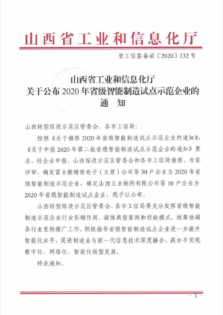 【喜訊】大禹生物榮獲山西省2020年省級(jí)智能制造示范企業(yè)榮譽(yù)稱(chēng)號(hào)