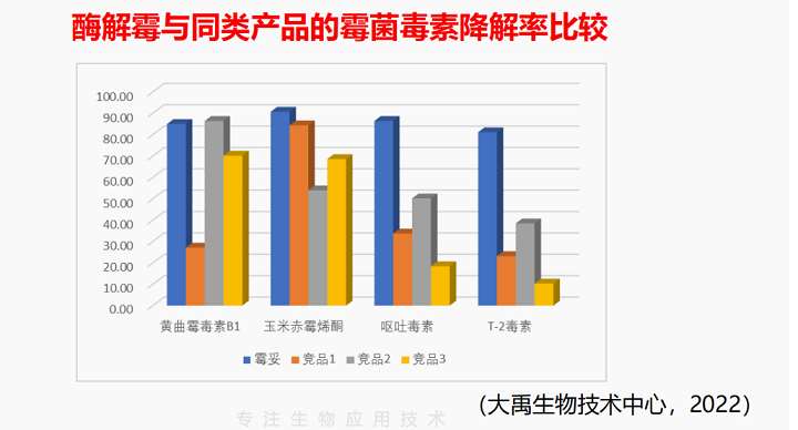 大禹生物的生物降解霉菌毒素產(chǎn)品是通過(guò)復(fù)合微生態(tài)制劑來(lái)表達(dá)氧化還原酶(去氧環(huán)化酶)、水解酶、轉(zhuǎn)移酶等霉菌毒素降解酶,降解霉菌毒素的毒性基團(tuán)、破壞霉菌毒素活性中心,致使霉菌毒素毒性變?nèi)趸蜃兂蔁o(wú)毒物質(zhì)。