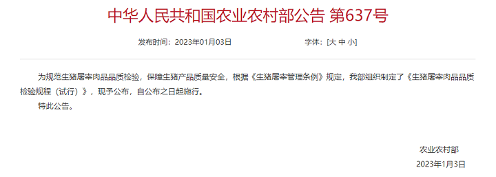 農(nóng)業(yè)農(nóng)村部公布《生豬屠宰肉品品質(zhì)檢驗(yàn)規(guī)程(試行)》